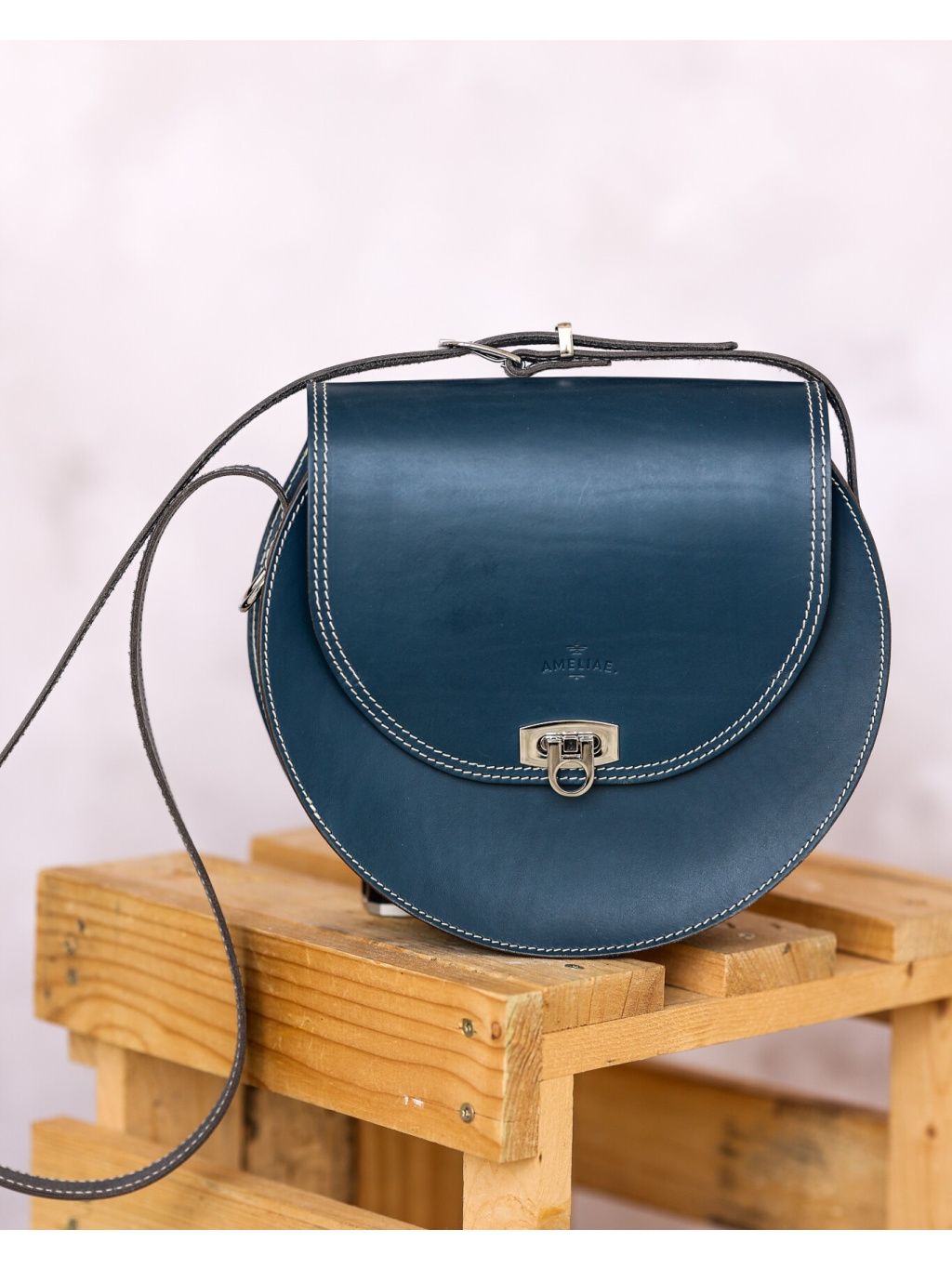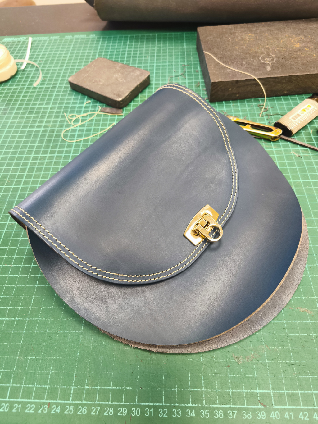 Vyrobená je z italské kůže v modrém džínoviny, s kontrastním přírodním prošíváním, které jí dodává osobitost a podtrhuje poctivé řemeslné zpracování. Díky svému tvaru si drží elegantní siluetu a zároveň nabízí prostorný vnitřek s menší kapsou – vejde se do ní telefon, peněženka, klíče i svačina či pití.