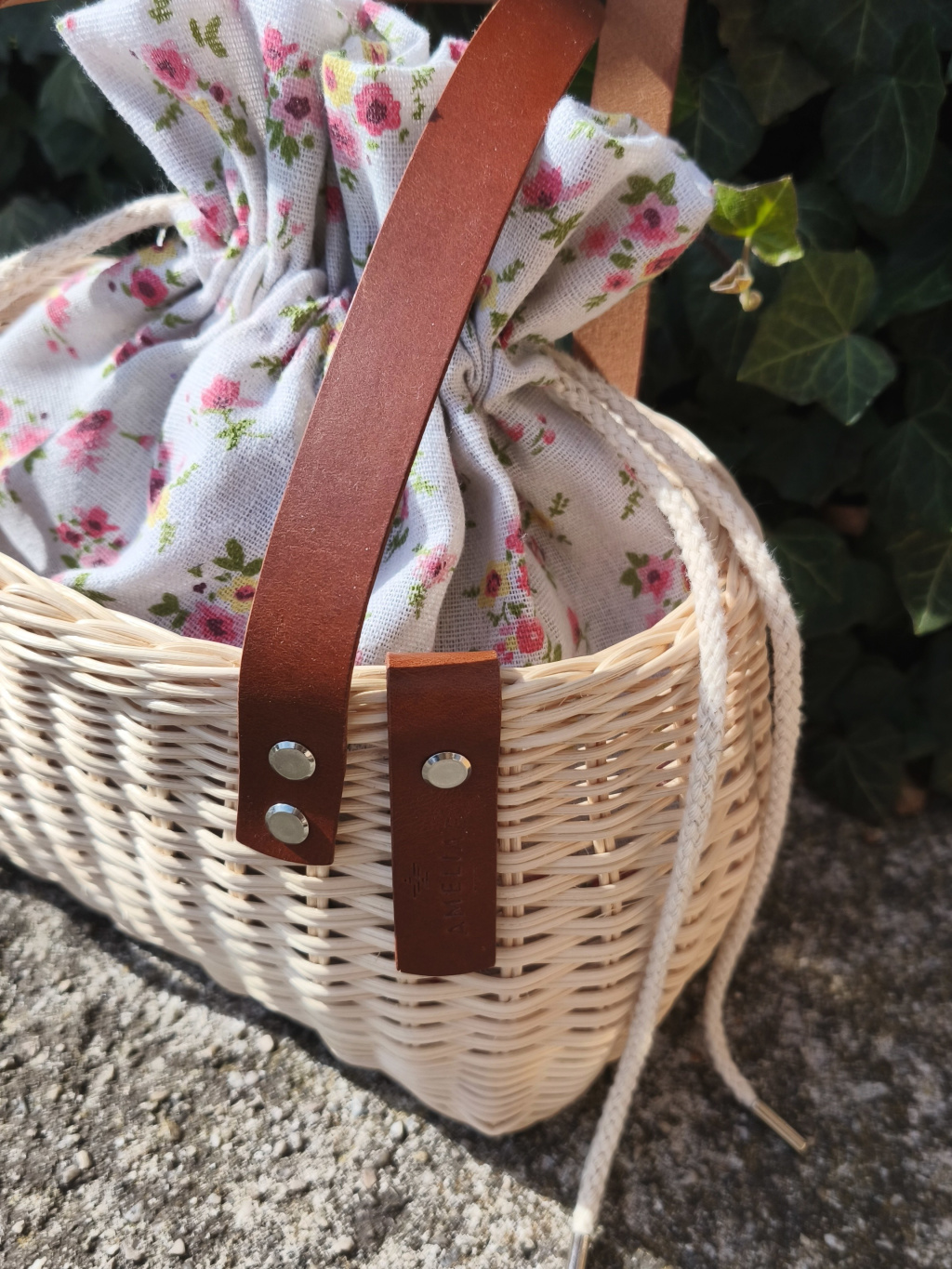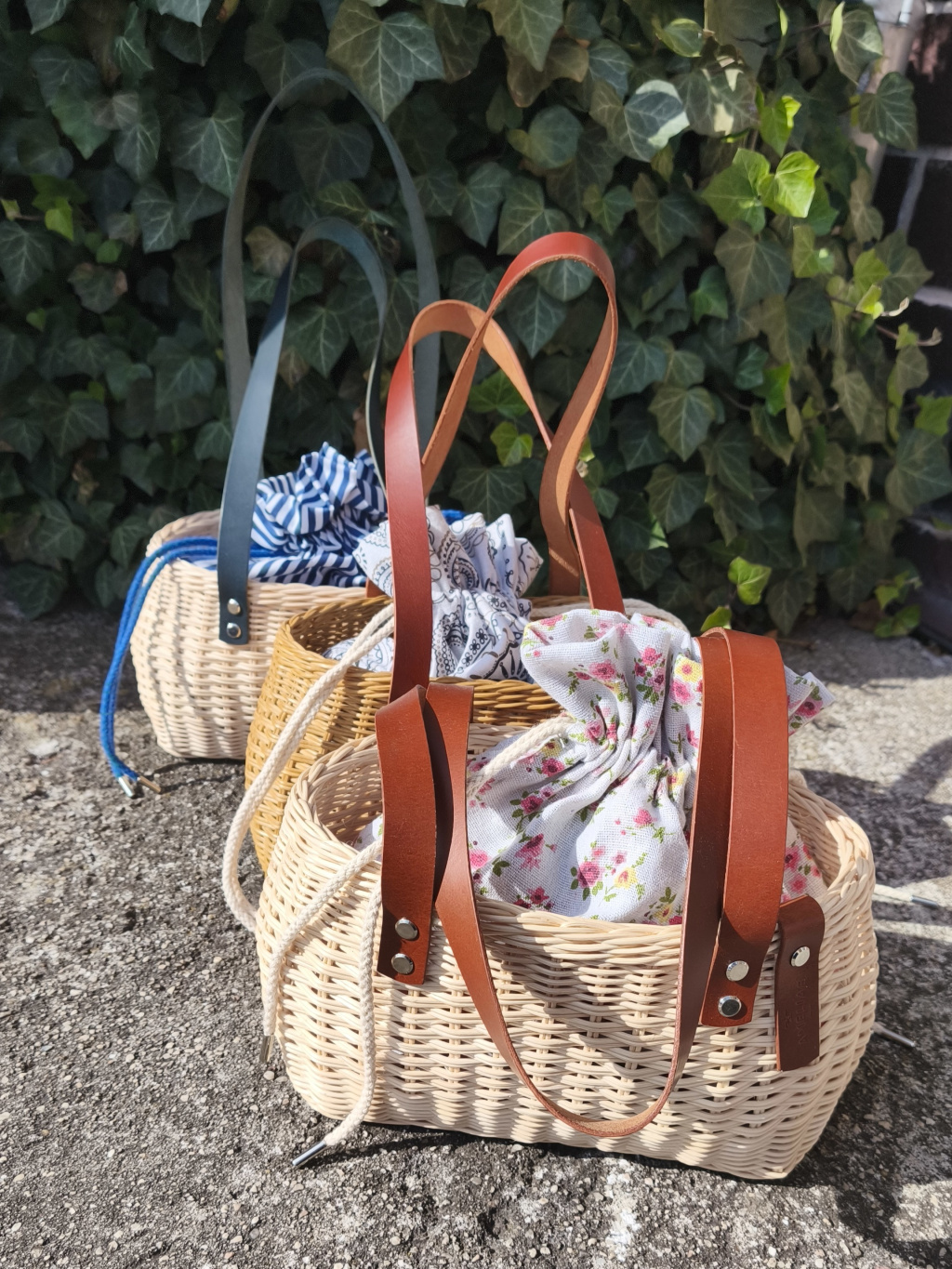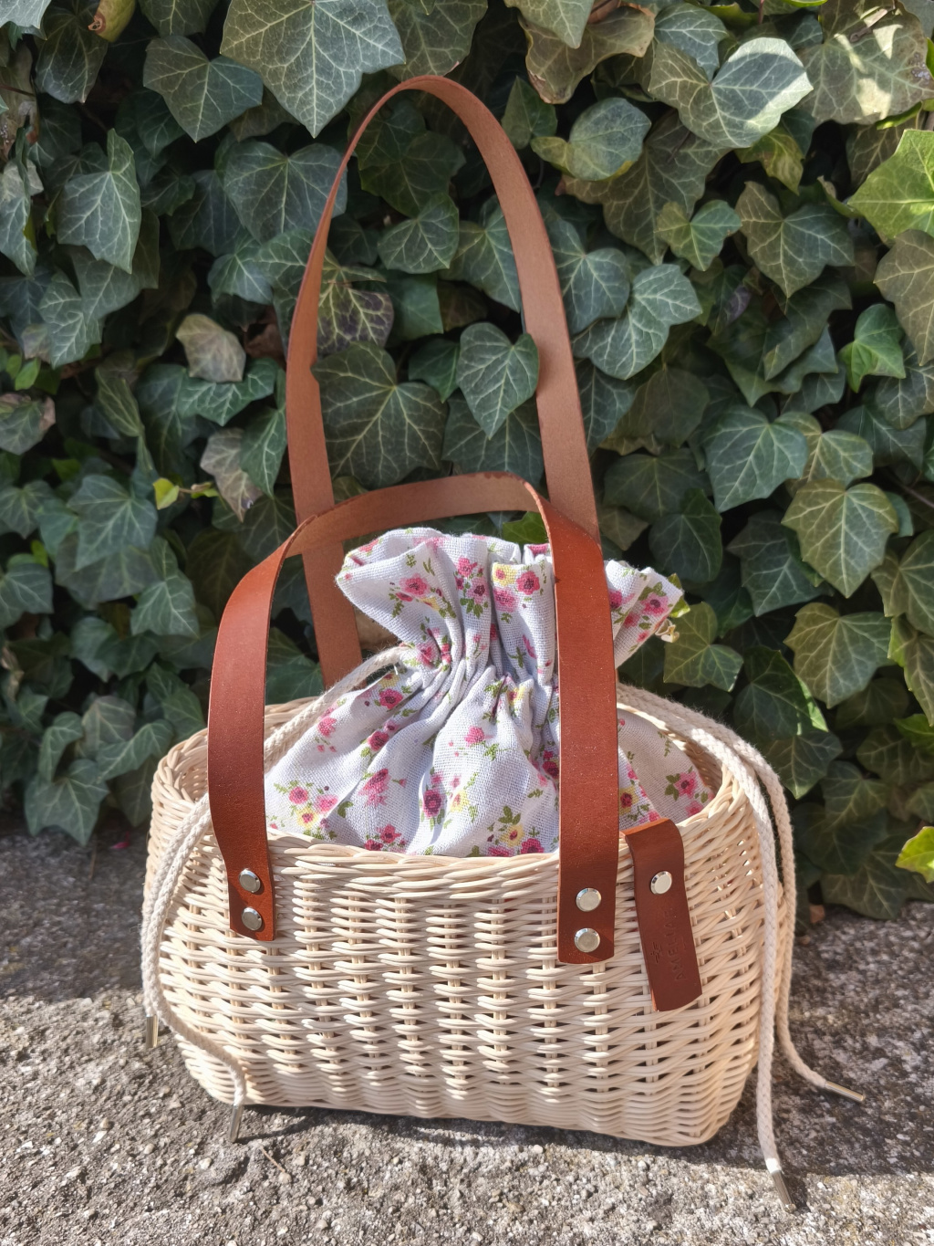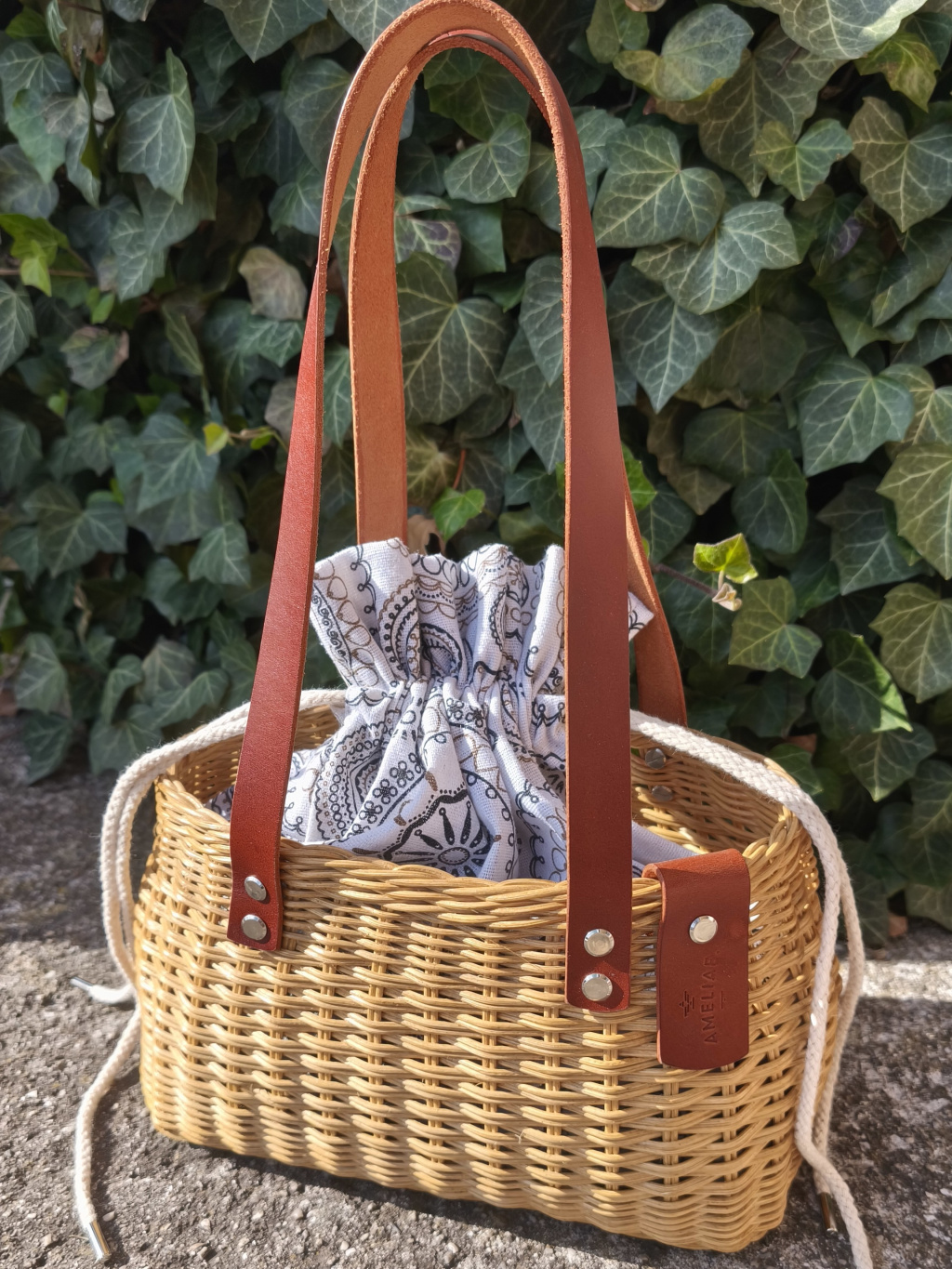Kabelku jsem upletla z přírodního proutí - pedigu. Je lakovaná a tím ošetřena proti znečištění a změně tvaru. Ze spodní strany je opatřena nožičkami.