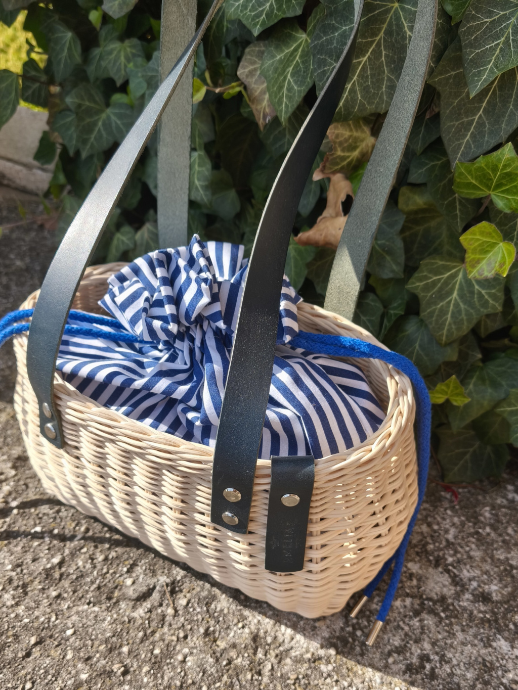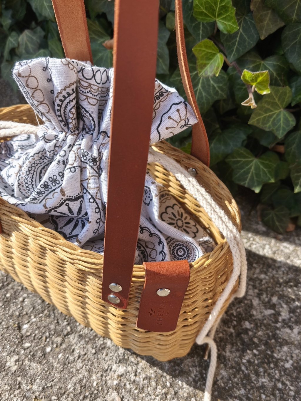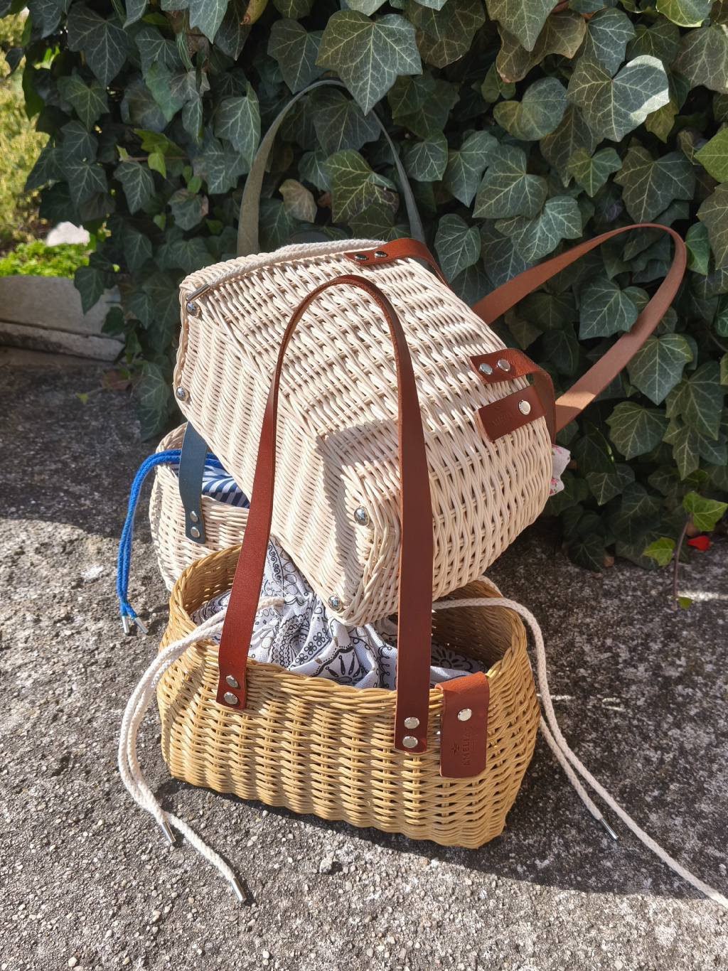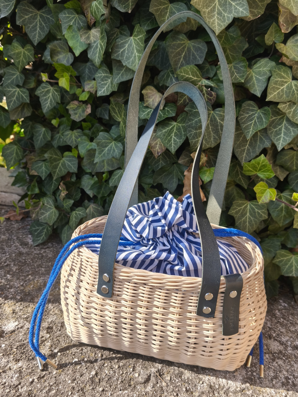 Kabelku jsem upletla z přírodního proutí - pedigu. Je lakovaná a tím ošetřena proti znečištění a změně tvaru. Ze spodní strany je opatřena nožičkami.