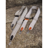 Bavlněný popruh má kovové komponenty v úpravě nikl, kožené části jsou ručně šité a barvu nitě vybírám podle barvy kůže.