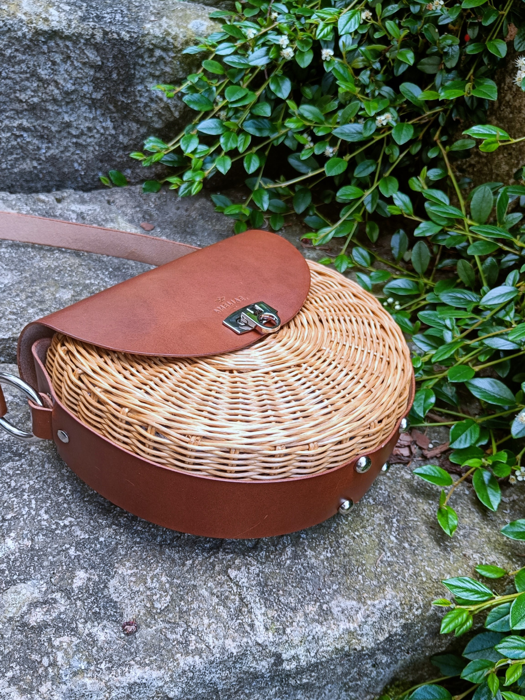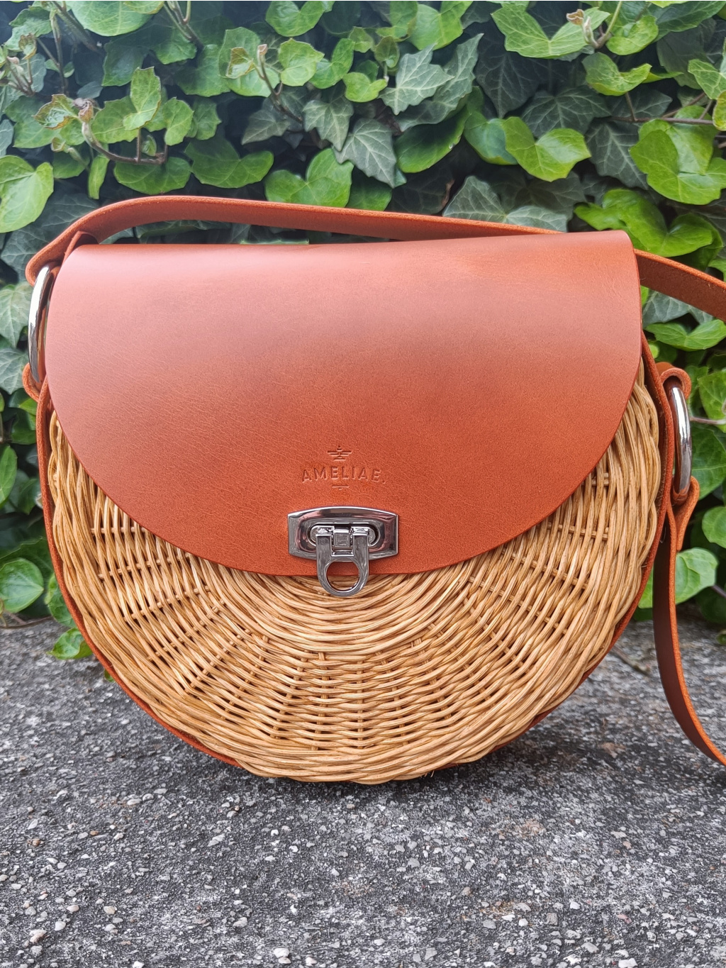 Kulatý tvar, který je napůl zakrytý klopou z prémiové italské kůže. Prošití nití v barvě kůže dodává kabelce jemný luxusní akcent.