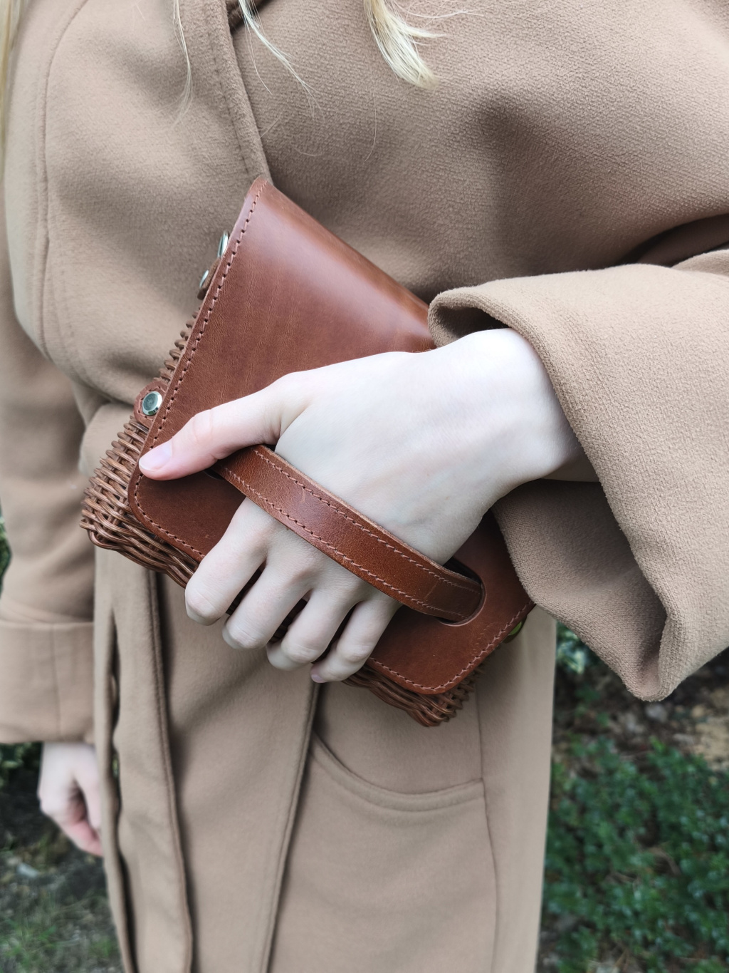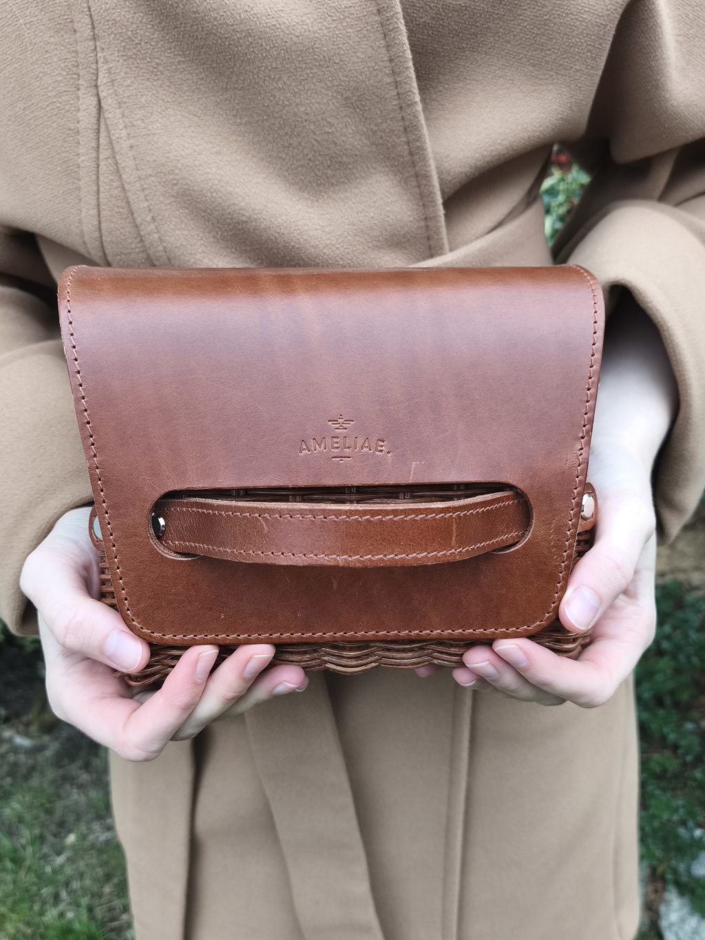Hnědá mini kabelka, která spojuje eleganci s ležérností – přesně taková je psaníčko Jeanne. Unikátní zapínání, které zároveň slouží jako poutko na ruku, dodává kabelce šmrnc a originalitu. Základem je krásně opracované hnědé proutí, které si můžeš doladit barvou kůže podle svého stylu. Kabelka je dodávána s koženým popruhem, ale pokud preferuješ něco elegantnějšího, můžeš si k ní vybrat volitelný řetízek přes rameno.