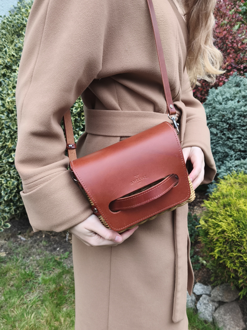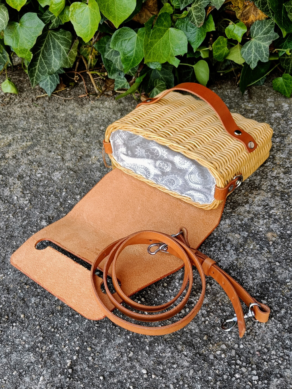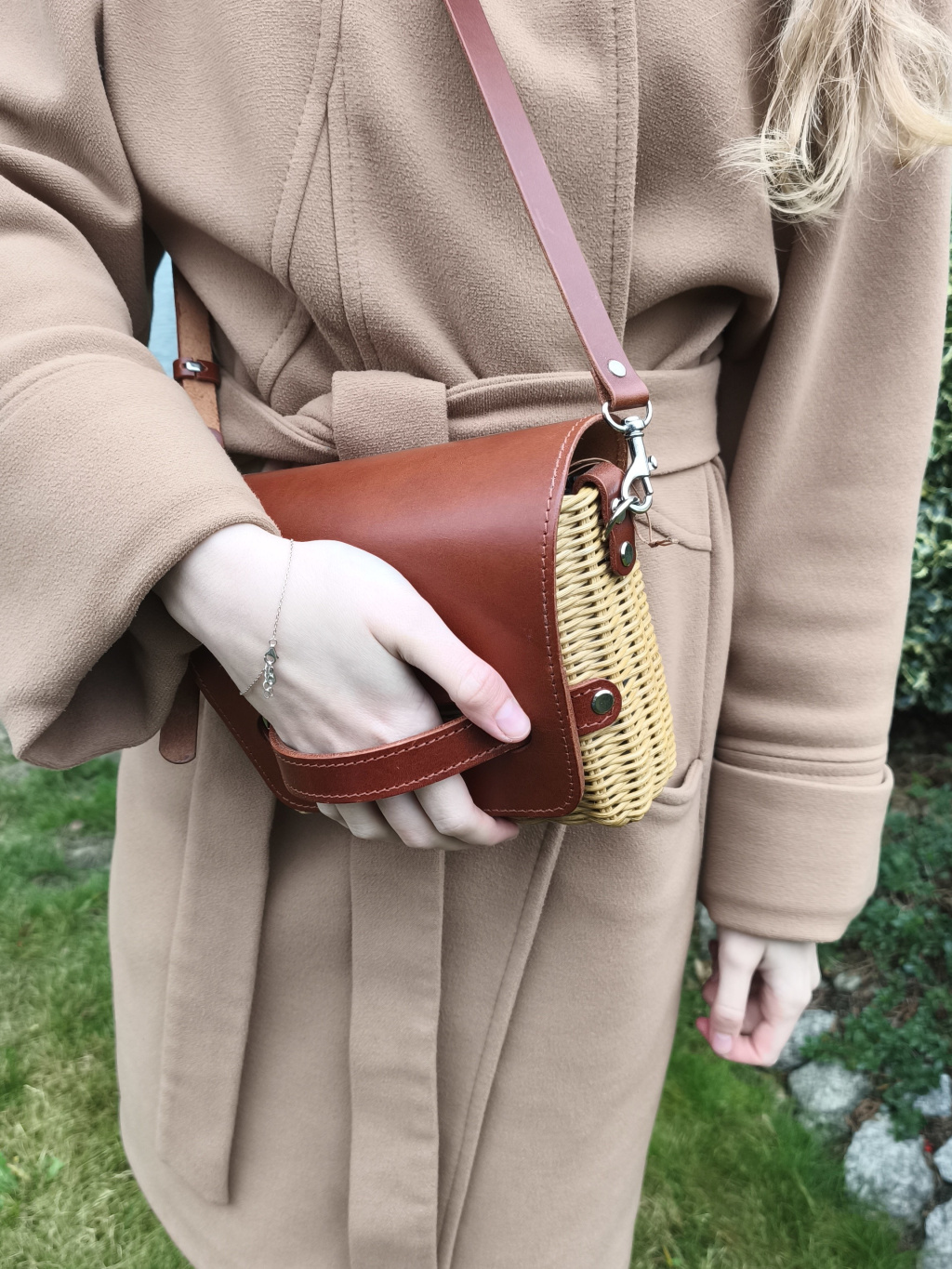 Kabelku jsem upletla z proutí - pedigu. Pletená je velmi jednoduše, aby kůže a kování bylo dominantní. Z vnější strany jsem kabelku pečlivě zabrousila a nalakovala.